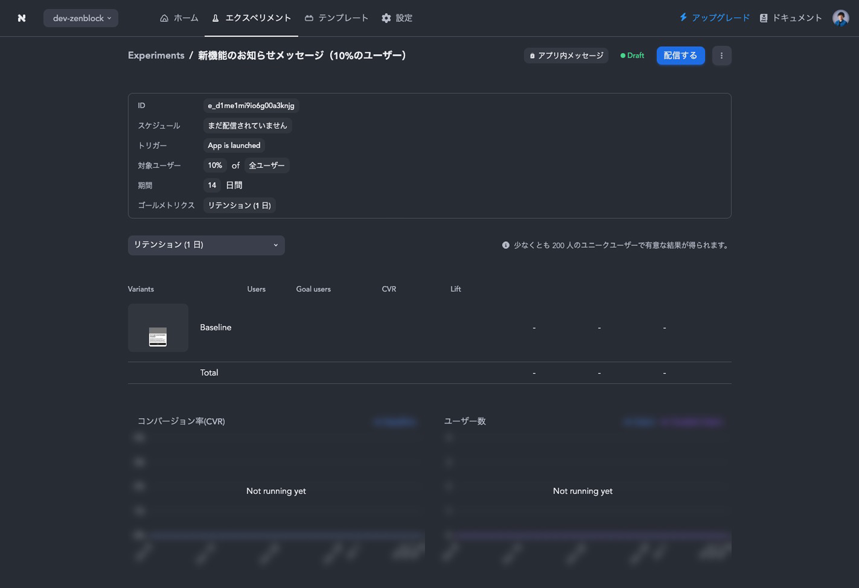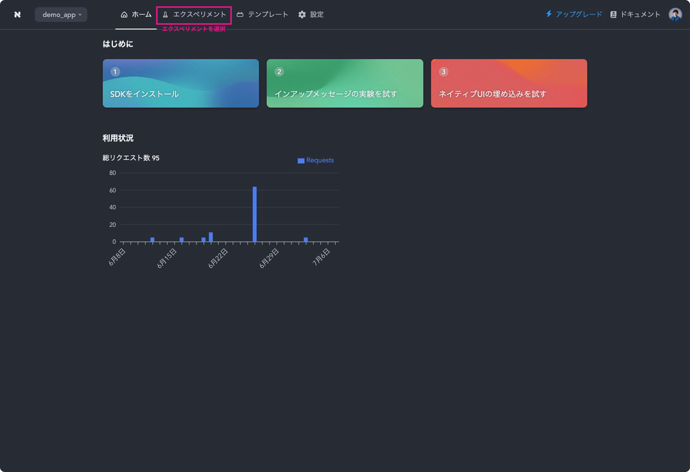 ログイン後、ダッシュボードページにアクセスし、以下の手順に従ってエクスペリメントを作成します。