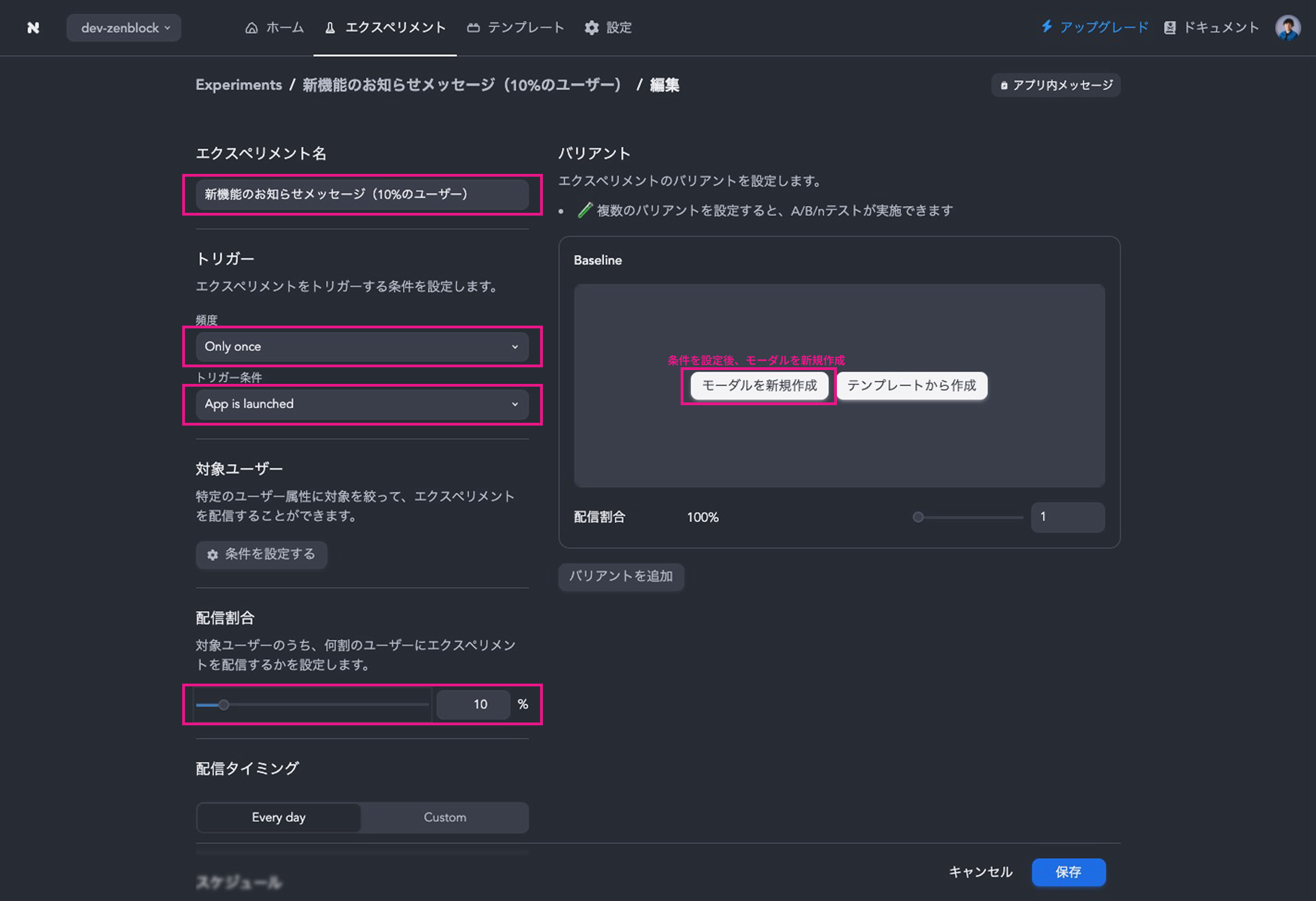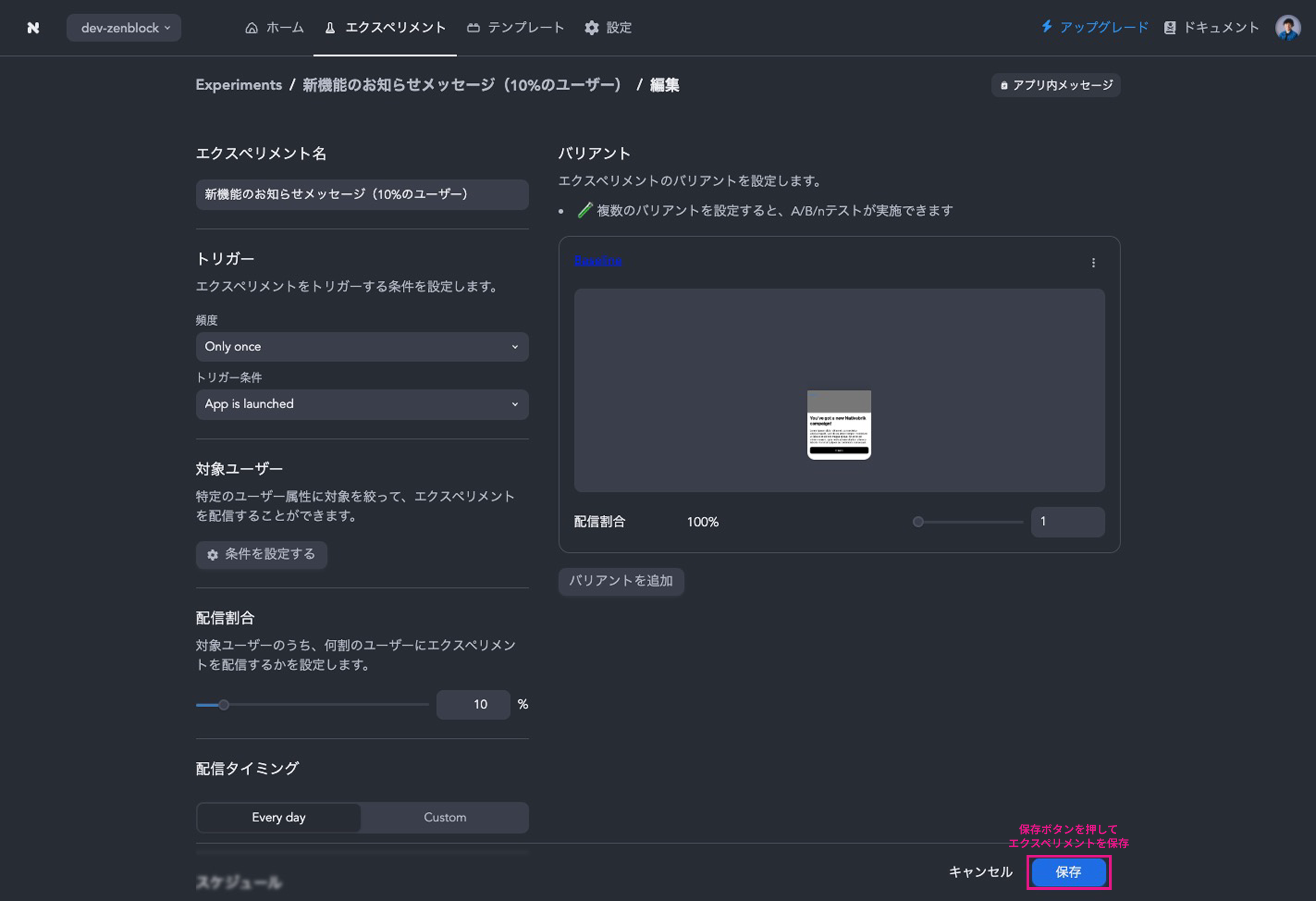 * エクスペリメント名に「新機能のお知らせメッセージ（10%のユーザー）」と入力