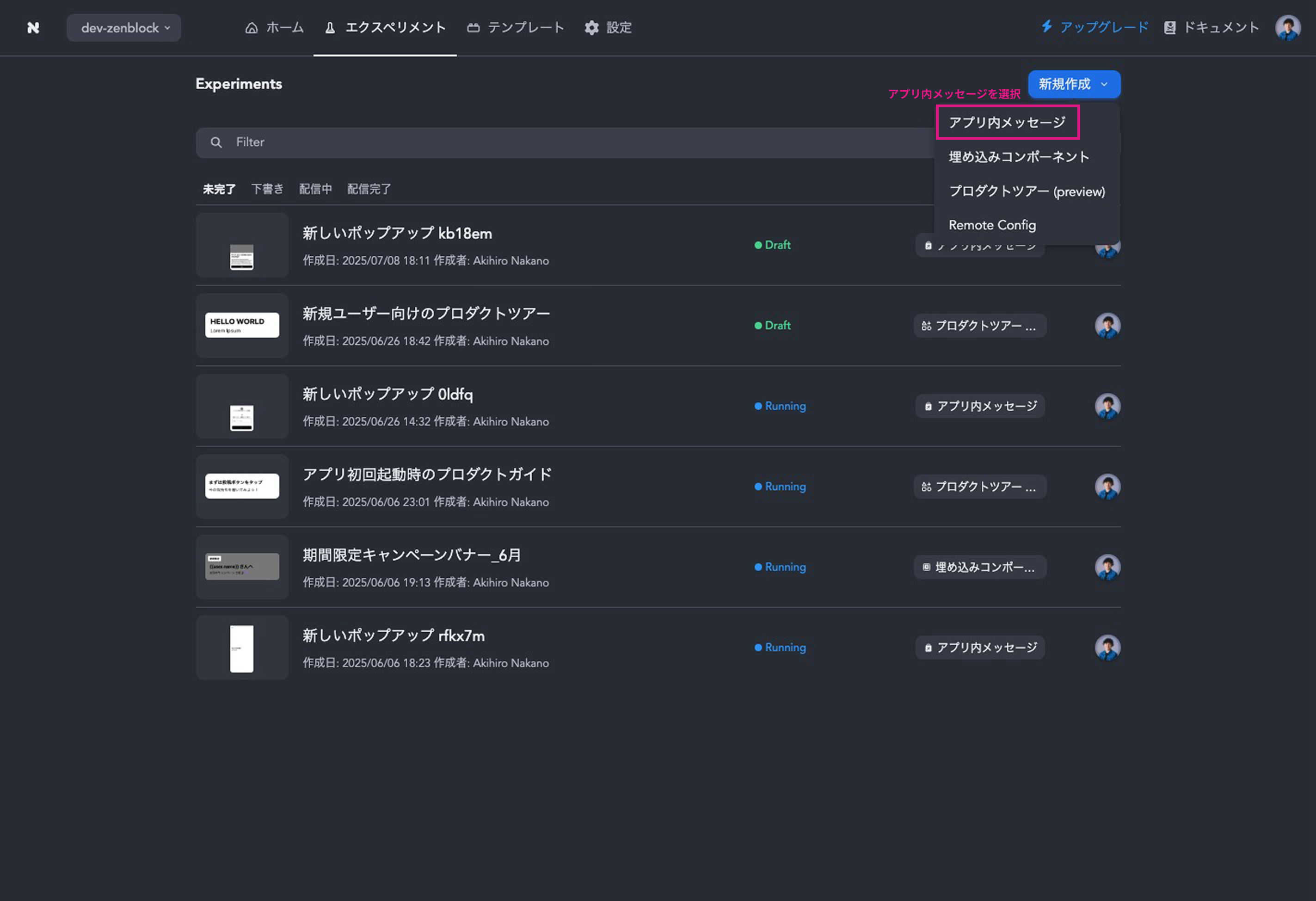 2. **「新規作成」ボタン**をクリックし、「アプリ内メッセージ」を選択します。